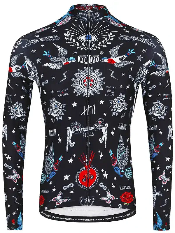 A love of tattoo art motivates miniature bicycle tattoo sketches, which are abundant in this jersey design, coupled with advice and hard-earned knowledge.