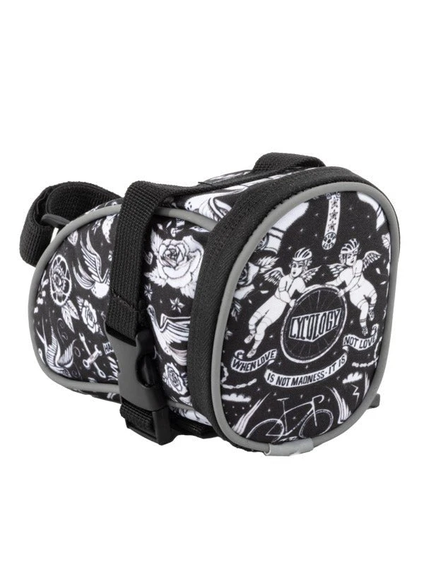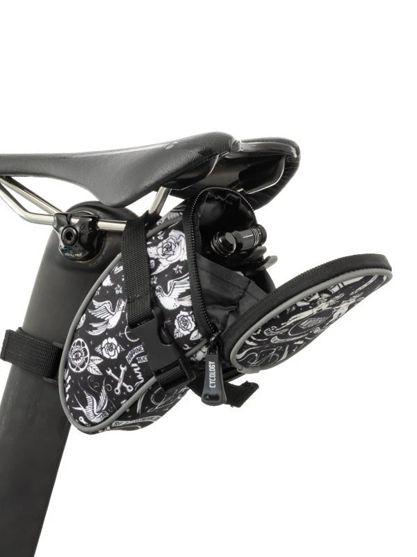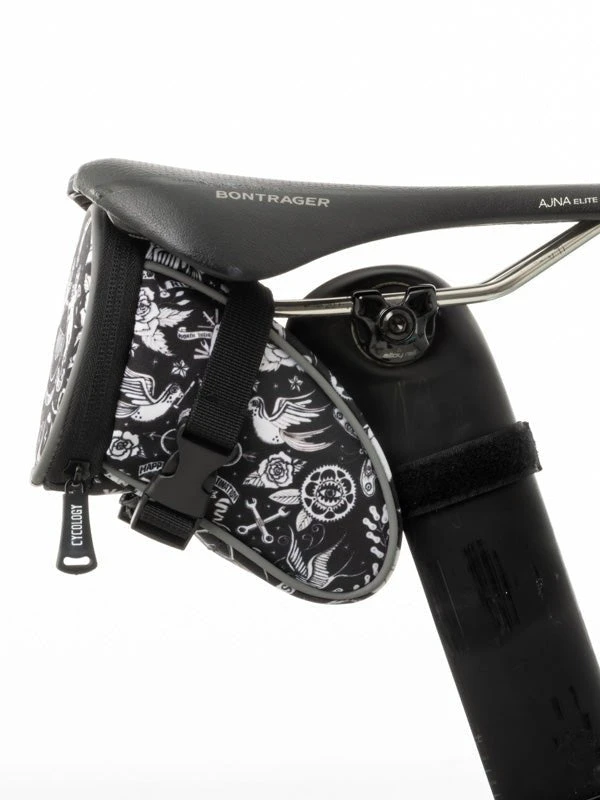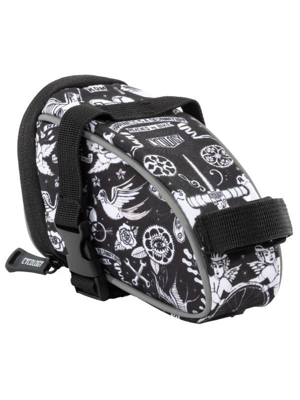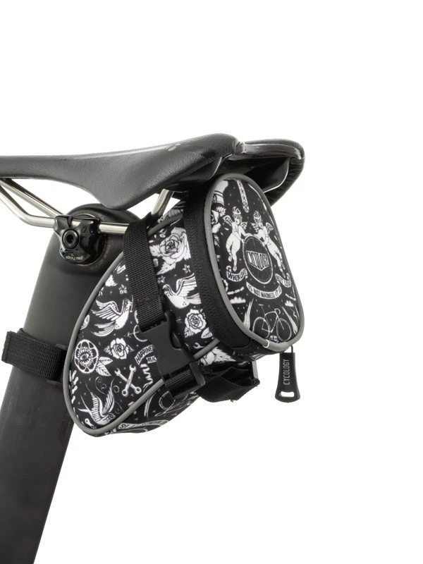 Attaching easily under your saddle with Velcro straps and adjustable buckles, it allows you to carry your spare tools, tubes, tyre levers, snacks, cash, keys, a mini pump, and anything else with confidence. For added safety and visibility it also features reflective piping on all seams and an original stylish Cycology artwork design.